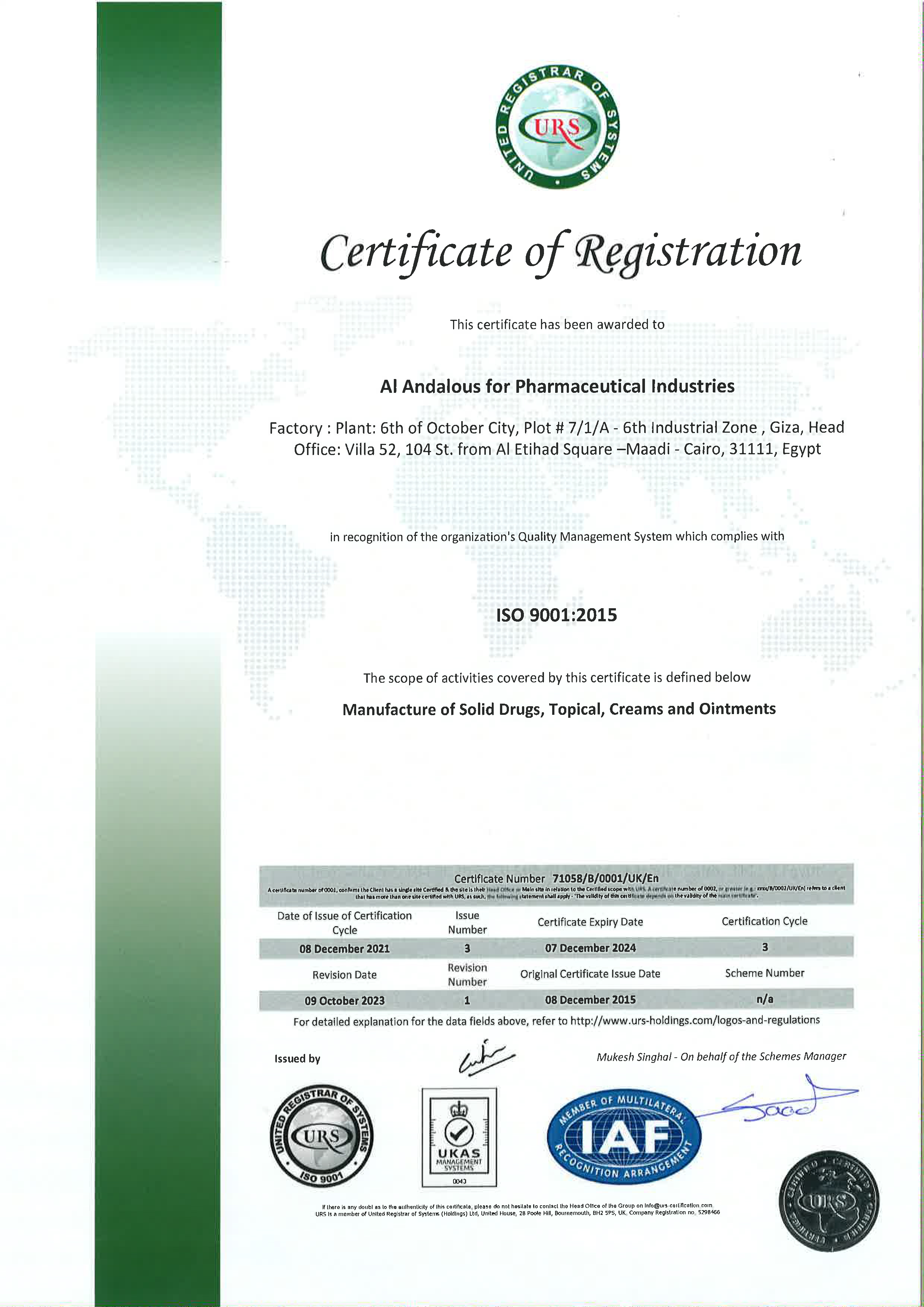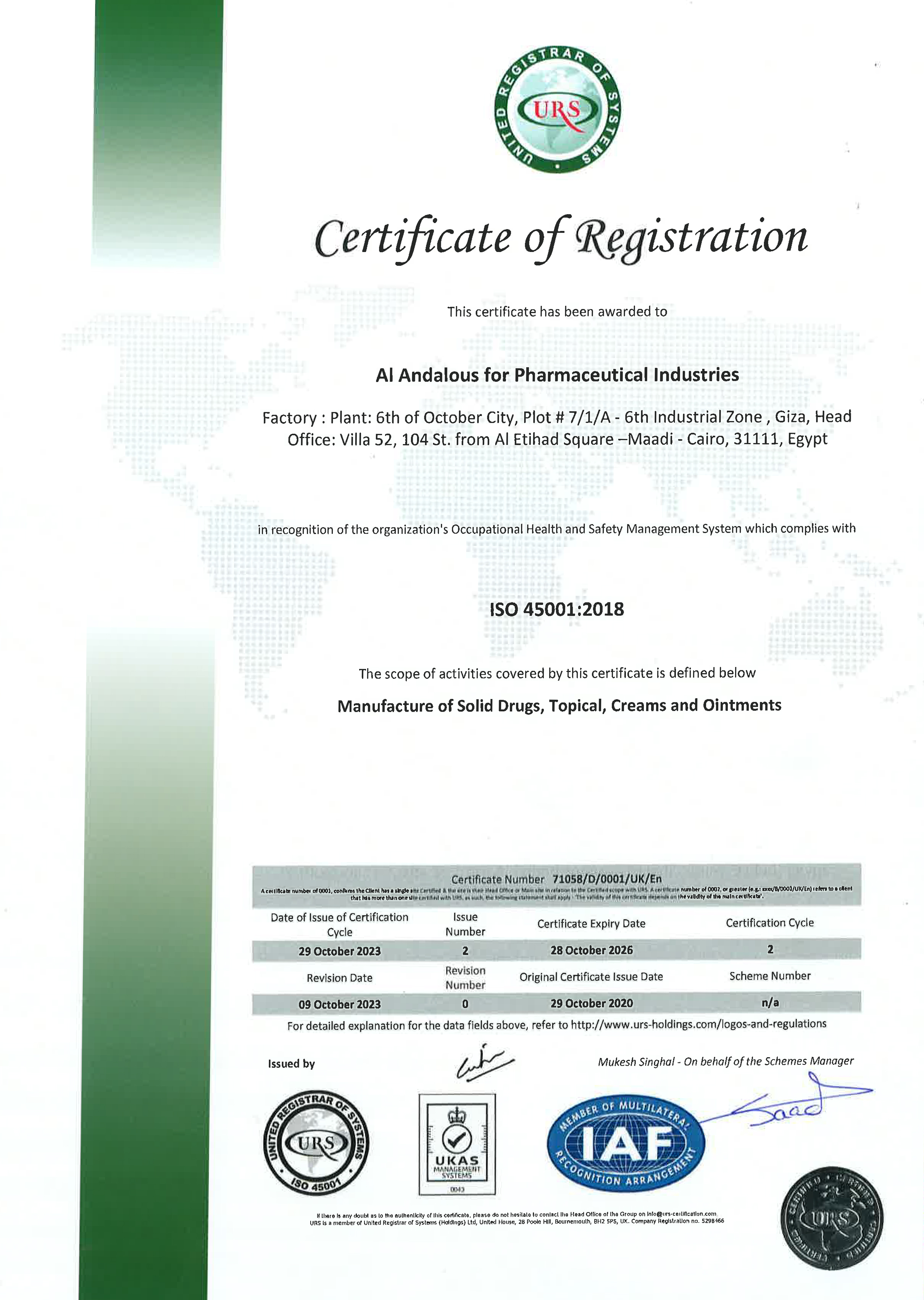 QMS IS DESIGNED TO meet cGMP requirements and ISO 9001:2015, ISO 14001:2015 and ISO 45001: 2018 standards and international standards (WHO and EMA) to ensure that all our products are consistently produced and controlled to the highest up-to-date national and international standards. Al-Andalous management is committed to continuously improving through implementing periodical &. systematic c GMP monitoring and rigorous training programs.